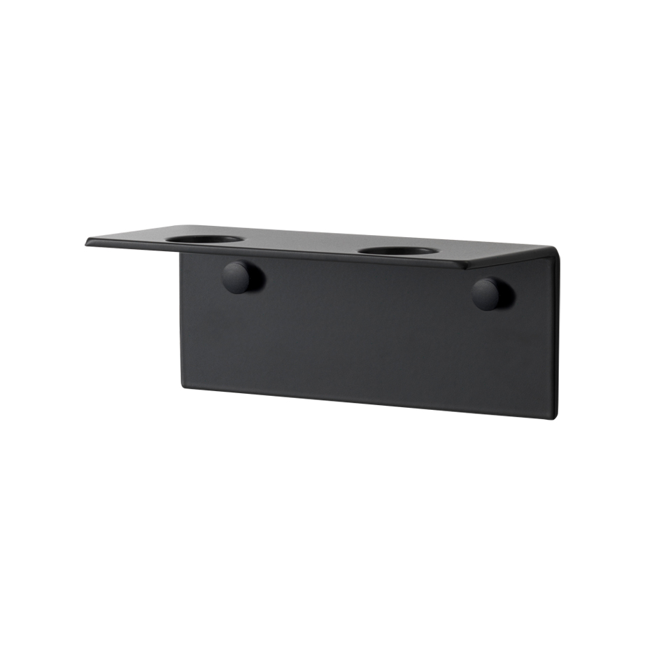 Toalettpappershållaren monteras direkt på väggen och levereras med både skruvar och svarta skyddskåpor för ett rent intryck.